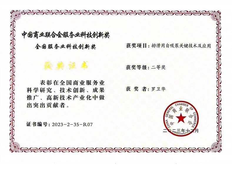 7月21日,中國商業聯合會主辦的2024年全國商業科技質量大會在北京召開。本次大會主題是“聚焦新質生產力 賦能行業高質量發展”。貝德科技集團總經理羅衛華研發的“排澇用自吸泵關鍵技術及應用”榮膺中國商業聯合會服務業科技創新獎二等獎。